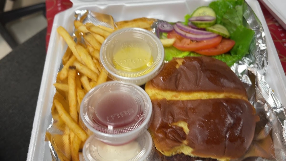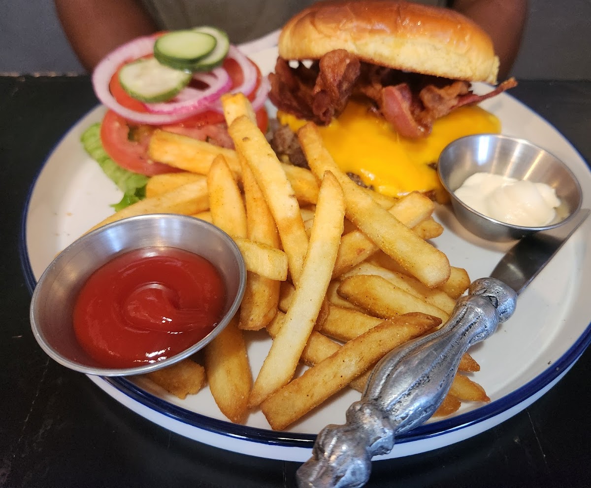 Nice, little cozy place. When you walk in the staff greet you. Serve was fast. The food was tasty. My husband had the smash burger, and I had the chicken sandwich with bacon, avocado, and jalapeno. The fries were a little overcooked. Our server was polite and very friendly . Bathrooms were clean and nicely decorated. Nice art work on walls for sale.